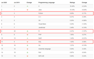 Phython은 3위에 R은 8위에 SQL은 11위에 각각 존재한다. 특히 R은 인기가 급상승해 작년 7월에 비해 12계단이나 상승했다. 그 요인으로 ‘티오베’는 대학과 연구기관에서의 R사용 증가와 코로나 바이러스 백신 개발을 위한 데이터 마이닝과 통계에서의 R사용 증가를 뽑았다. 통계와 데이터 마이닝에 있어 R의 유용성이 드러난 것이다. 데이터경영학과 학생들은 앞으로 R을 더욱 열심히 공부해야겠다.